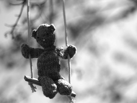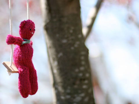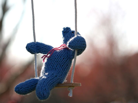 I simplified Vanessa Carter’s Bubby pattern and used size 8 needles and a lot of the acrylic yarn I had from when I was learning how to knit. Into each swing, which I built in our woodshop, I nailed a large nail in order for the bears to have something to sit on and hold them upright. Another successful adorable work!