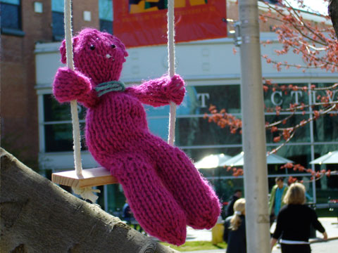 Bears on Swings is a celebration of the springtime depicted through nature’s most notorious hibernators: bears. The work is comprised of approximately thirty hand-knit stuffed bears suspended by swings from the trees which line the academic mall.