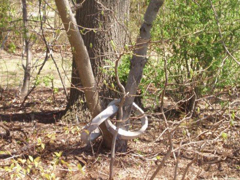 Outdoor installation featuring a cement cast of two large “wedding” rings epoxied around two trees diverging from the same spot in the ground. The initials of myself are cast into one ring and the initials of a secret male are cast into the other.