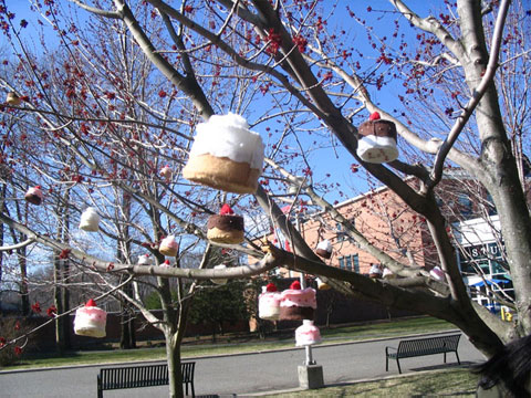 “Call Your Mom” is a public installation I did on the Stony Brook Campus for Unbound, which is part of the Shirley Strum Kenny Art Festival. I constructed 45 small ramekin cakes out of felt and hung these from the lower branches from a single tree on campus, located outside the south…