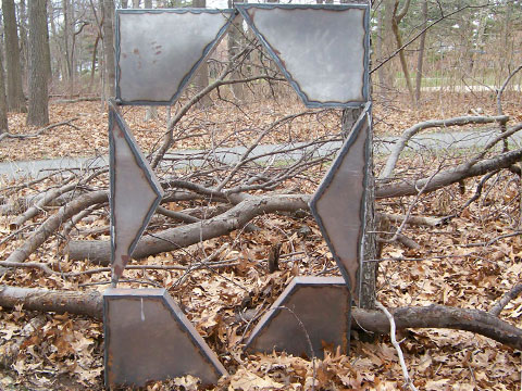 Welded steel. From a frontal view, this sculpture resembles the Star of David. Rotation around the sculpture abstracts the form. Conversely, it’s an abstract sculpture that just so happens to look like the star of David from only two points of view. 5’ tall x 5’ wide x 9”…