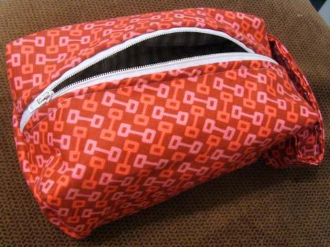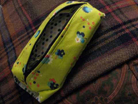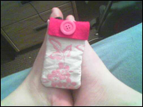I knit a cozy for my brand new iPod Nano. I followed Julie Ree’s instructions up until a point and then strayed, such is my nature even though I will it not to be. The inside is lined in red felt and the button hides a functional snap enclosure. The fabric is old paJAMZ! from GAP that I got…