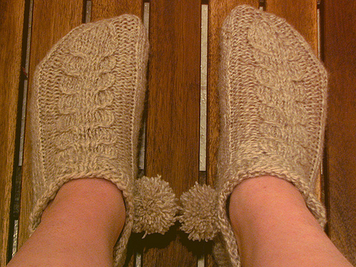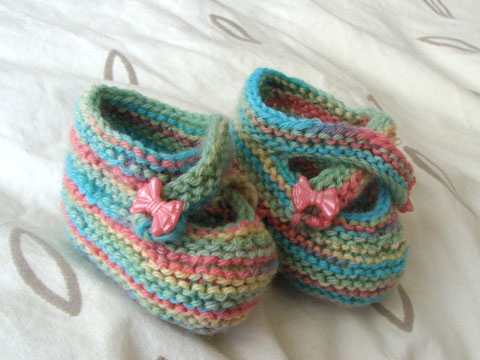 Hello! It’s been a long time since I knit anything because I spent most of 2010 sewing handbags or not doing anything creative at all! These are some booties for a fetus. It’s about to turn into a baby any day now. It’s the first baby item I’ve ever knit and it went by…