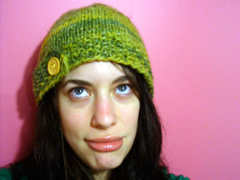 Hello! This is the Banana Republic Hat for my friend Chantal’s birthday. Chantal looks gorgeous in green. As I was knitting it I felt like I had fiberglass filaments in my eyes and nose. I’m not allergic to anything so I don’t know what’s up with that. I would hate for this…
