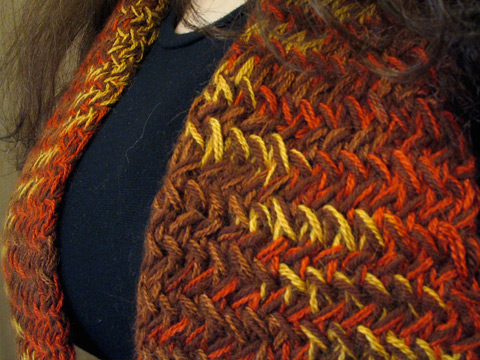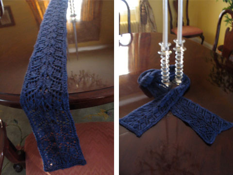 This scarf is the marriage of two different yarns. It’s Knitpicks Essential in Cocoa, left over from Brian’s Diamond Waffle socks, paired with double stranded Knitpicks Gossamer. I bought this yarn in early 2006 for my mom’s Clapotis which she never ever wore. It’s a…