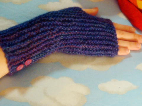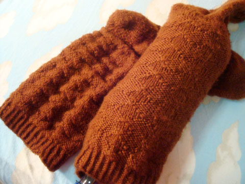 I started these in another yarn during Cloverfield, ripped and reknit while watching There Will Be Blood, and sewed everything up while watching O Brother Where Art Thou. They’re for a friend and they’ve got a button detail on the wrists. Down. Up. Button button.