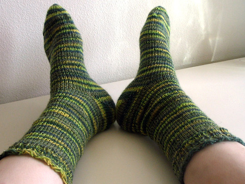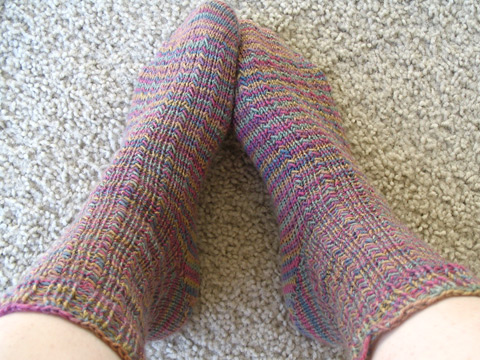 Not much to say about these socks. I wanted to knit socks but I don’t wear knit socks because my feet overheat easily. Initially I started with the Hat Heel Pattern from Knitty and while I love how the heel looks like a little target with self-striping yarn, I thought that the gussets were an…