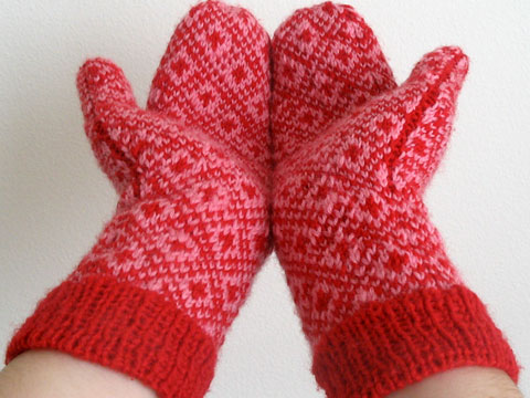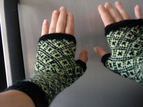 These are Endpaper Mittens based off of Eunny Jang’s Endpaper Mitts, which I knit before in the summer of 2007 and loved them. In March 2008 I lost one and it was terrible. Converting to mittens was easy; I knit two more pattern repeats for the fingers and decreased by four stitches every…