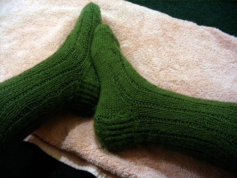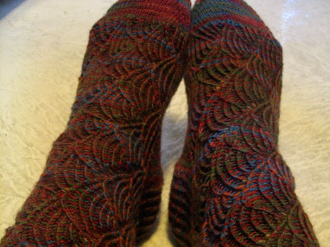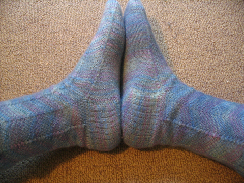 Hello I feel fine thank you. I am presenting toe-up Jaywalkers, which were fun to knit. I bought one 400-yd skein of yarn which I approximately wound in half and then used one of the balances in my chemistry laboratory to get it exactly 50/50. CHEMISTRY IS COOL. I have narrow feet so I made the…