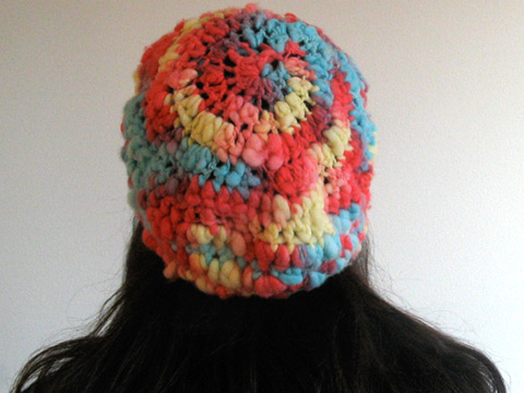 I wanted to create something ugly. There was this inhibiting perfectionism in my system and I felt the only way to let go was to make a most hideous accessory and be proud of it. It looks like a bad tye dye hat made entirely of bobbles. The yarn is a homespun thick-and-thin but mostly roving…