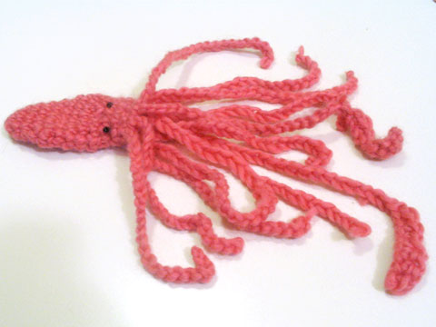 My favorite coworker collects squid figurines in his cubicle. I crocheted him this in pink, my second favorite color. I would have loved to have had some crochet cotton on hand because the yarn is extremely fuzzy and un-crochet-like, but Portland was experiencing the SNOWSTORM OF THE CENTURY and…