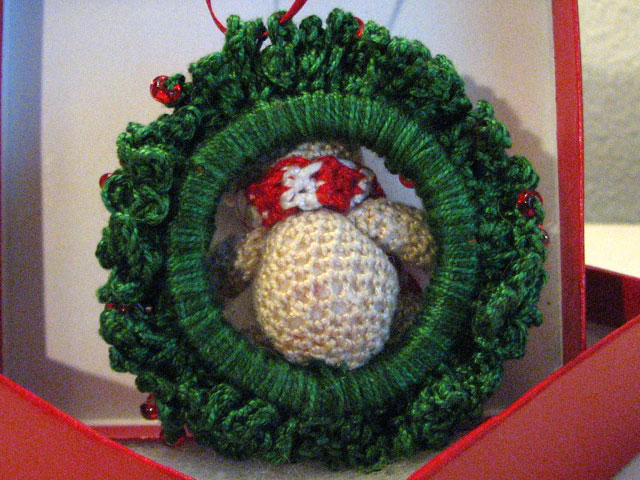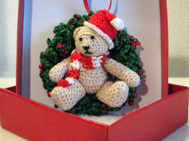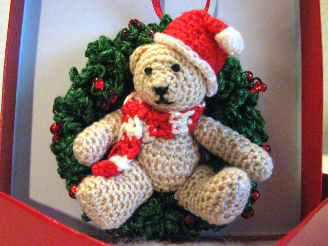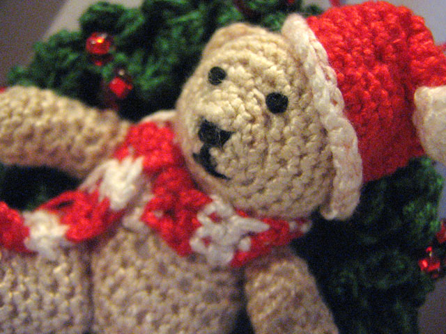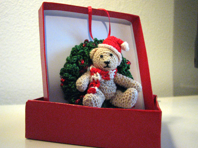 I crocheted the tiny bear as a Christmas gift for my boyfriend Andy’s mom, or as he calls her, Mum, because he’s from Northern Ireland and that’s hot. We mutually decided that an appropriate gift would be a Christmas ornament since his parents were welcoming me into their home for the holidays, and it would be a nice symbolic gesture where the ornament could act as a proxy for me being there at Christmas forevermore. I decided on my own that it was more within my ethos to make the ornament myself. I found “Beary Christmas” by Sue Pendleton on Ravelry and was struck by the level of detail and complexity of the finished object compared to all the other patterns for ornaments on Ravelry. I wasn’t sure I’d be able to pull it off, as my crochet skills are improvisational and intermediate at best, but I decided to take the risk. I was glad I did because I ended up creating something so fulfilling that I wanted to immediately leave my job and pursue crocheting tiny bears full-time.